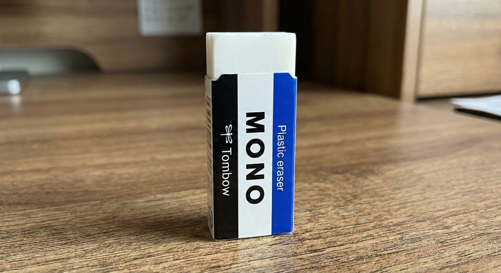 If you walk into any classroom or office in Japan, you will see this blue, white, and black striped block. Since 1969, the Tombow MONO has been the gold standard.
