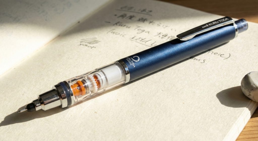 The Uni Kuru Toga solved this with pure genius. Inside the barrel is a tiny orange gear called the “Kuru Toga Engine.” Every time you lift the pen from the paper, the gear rotates the lead by 9 degrees.